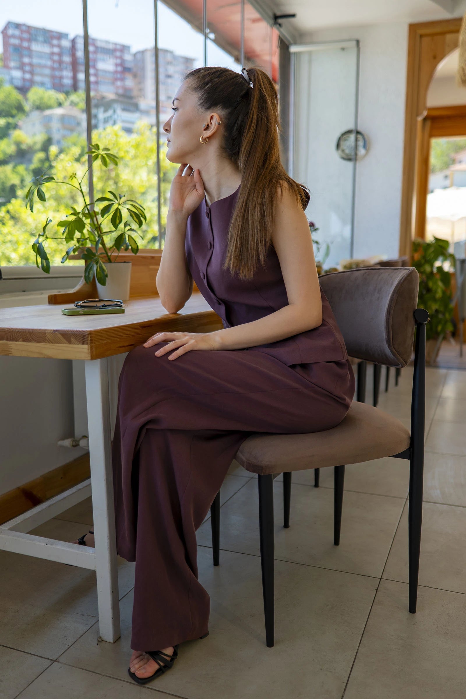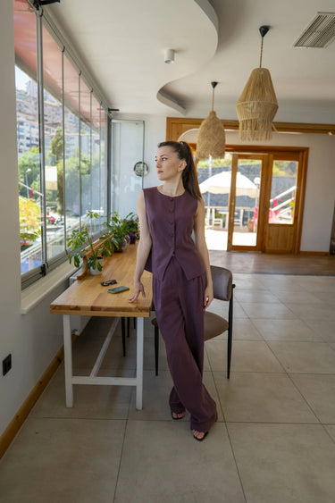 Düğmeli Yelek ve Pantolon Takım Mürdüm