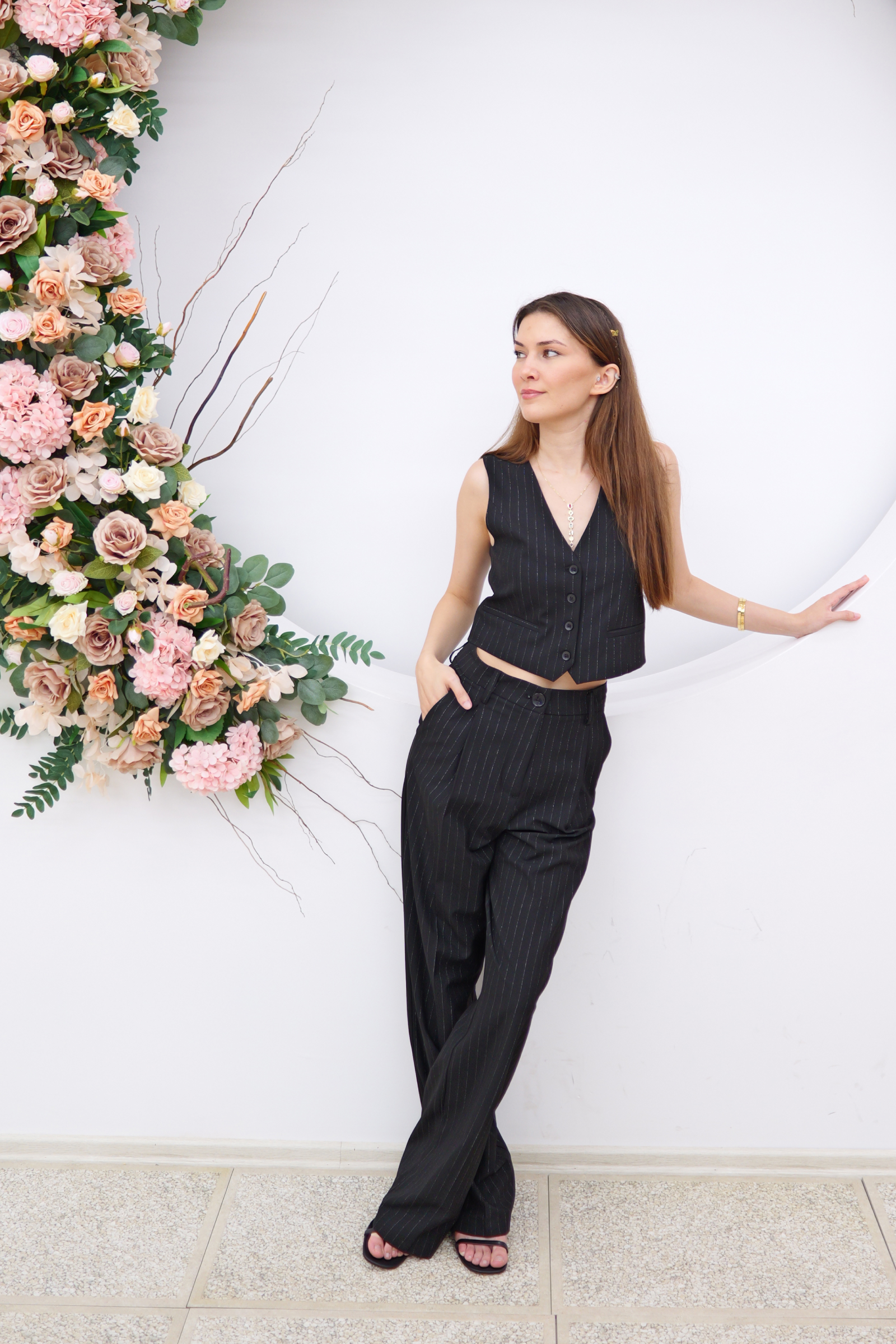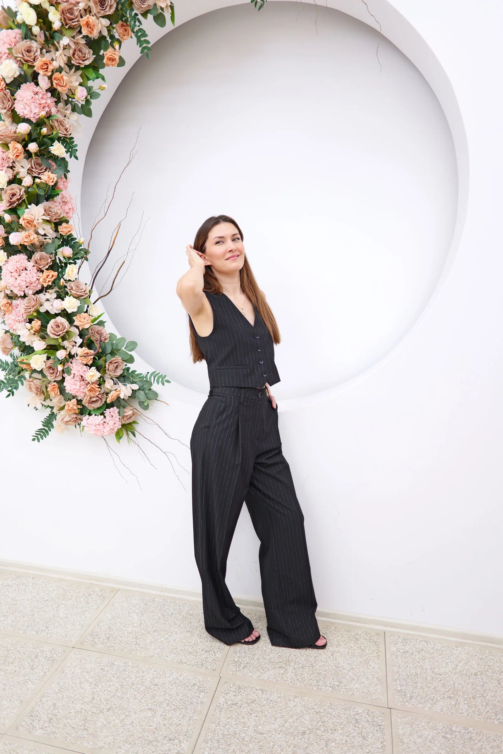 Simli Düğmeli Yelek ve Simli Yüksek Bel Pantolon Siyah