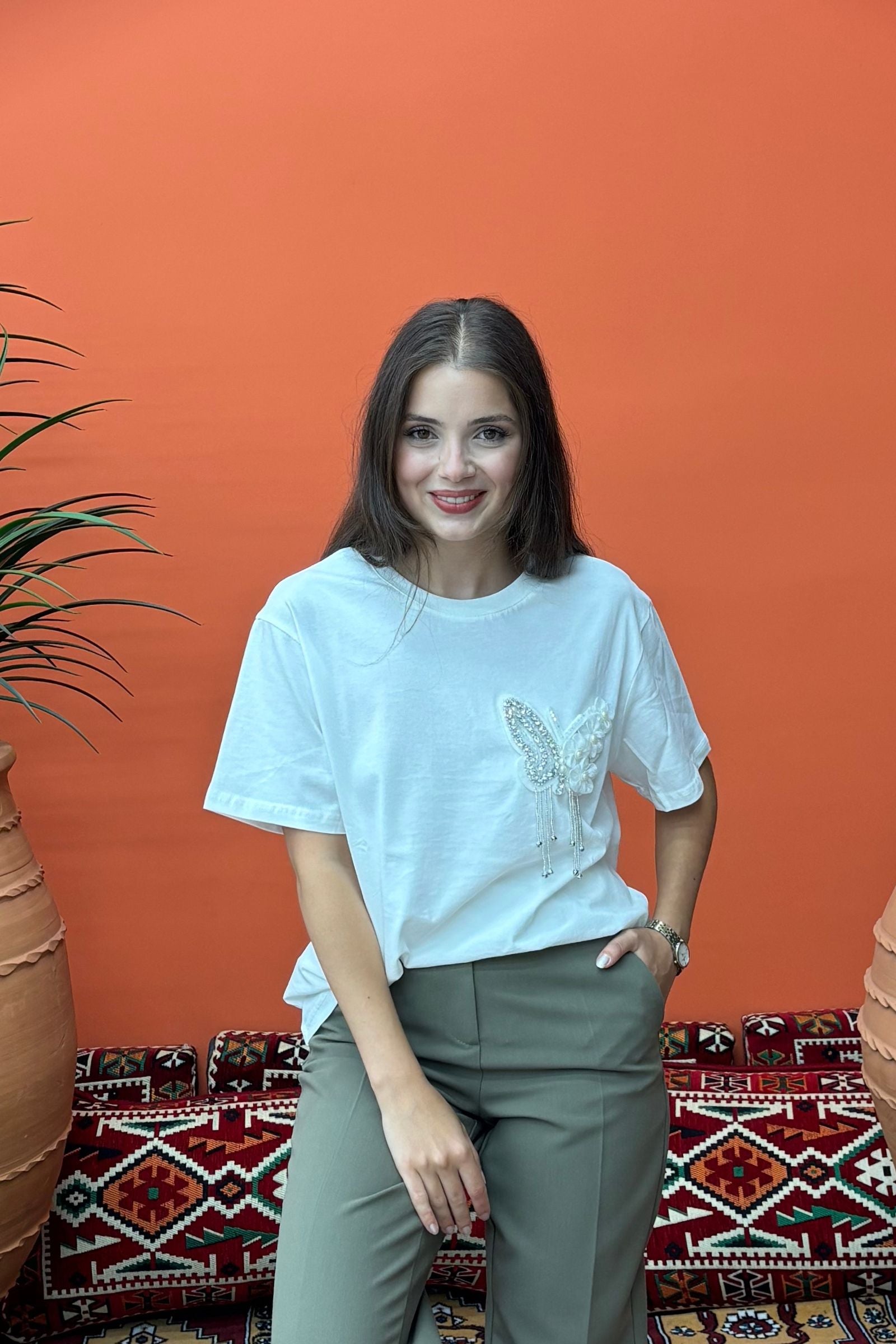 Kelebek Taşlı Beyaz Tişört